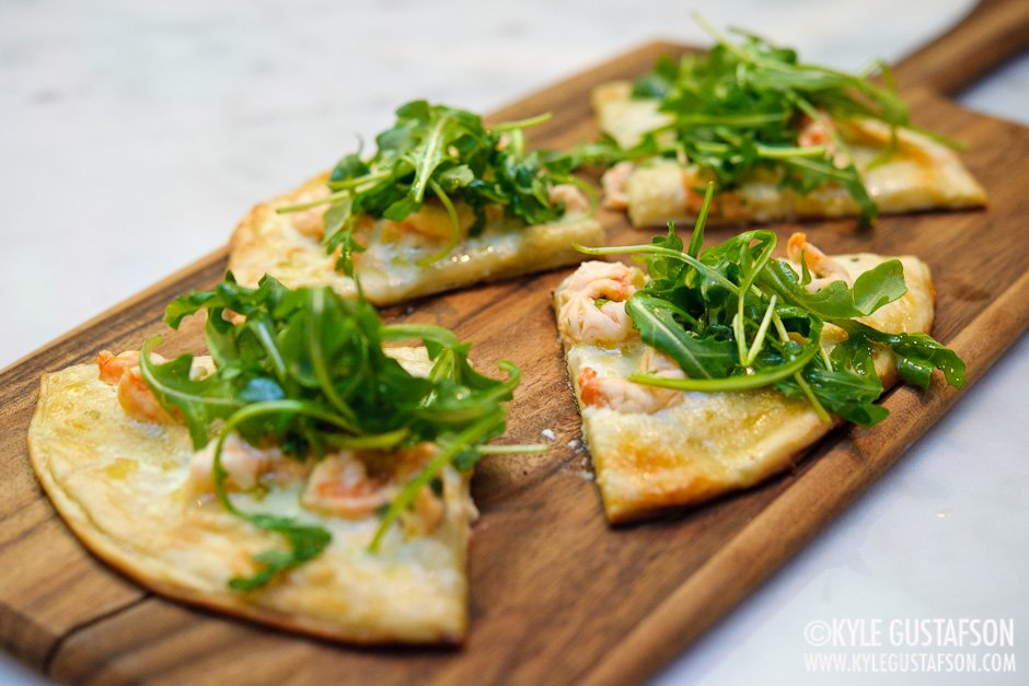 - Flatbread with stracchino cheese, marinated shrimp, garlic, and arugula.