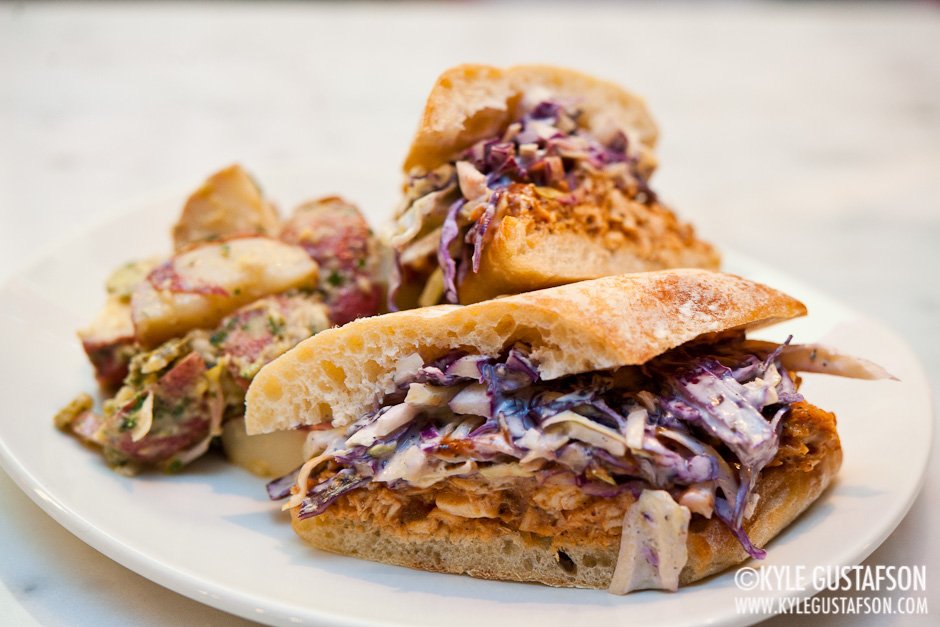 - Blue cheese coleslaw tops a sandwich of pulled roasted chicken.