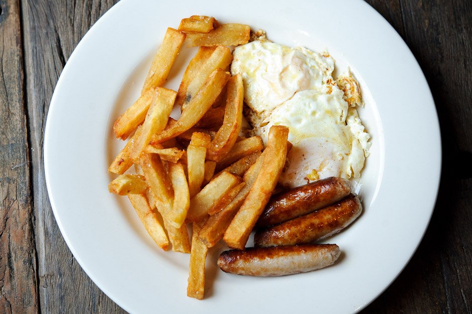 - Sausage, egg, and chips.
