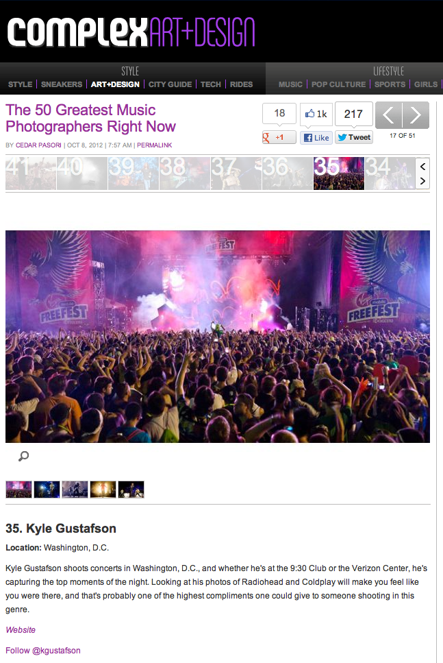 I was as surprised as anyone. I don’t recall ever speaking to anyone at Complex Magazine so I had no idea I was even on their radar. I’m humbled that they would like my work enough to recognize me along with so many other talented photographers. I like to think I’m one of the best, if not THE best, concert photographer in the D.C. area, but since I’m not in NYC, Chicago or L.A., I really have no idea if anyone is paying attention to the photos I post on this site. But one of the things I always tell other creatives is that you never know who is watching your work. All it takes is one email, one phone call or one chance meeting and your career can take off. So keep grinding. Thanks to Complex for the honor and congrats to all the other photogs that made the list.